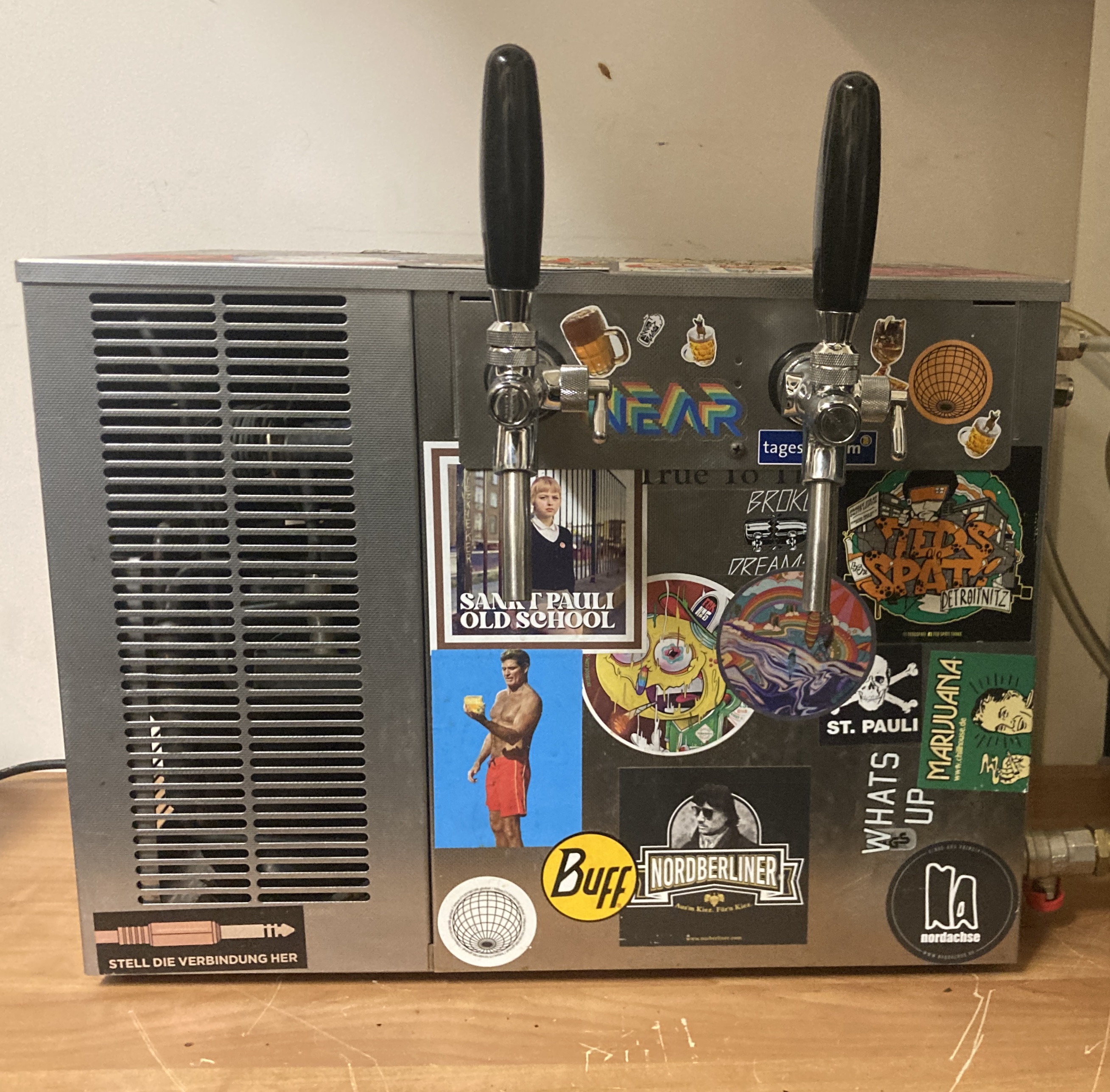 Zapfanlage für Feiern zu vermieten. Die Anlage hat zwei eingebaute Zapfhähne - dadurch können zwei verschiedene Bierfässer gleichzeitig gezapft werden. Natürlich ist auch nur der Betrieb eines Hahns möglich. Man könnte theoretisch auch noch drei weitere externe Zapfhähne anschließen. Es handelt sich um einen Nasskühler. D.h. die Leitungen werden durch einen eingebauten Wassertank gekühlt (es entsteht eine Eisbank im Inneren). Dadurch ist ein hoher Durchfluss möglich und es kann auch für größere Feiern genutzt werden. Ein Stromanschluss wird benötigt. Alle benötigten Schläuche sind mit dabei. Zwecks Kohlensäure: Wir betreiben sie über handelsübliche Sodastream Kartuschen. Entsprechende Kartuschen mit Adapter können mit dazu gegeben werden - ebenso Zapfköpfe für den Anschluss (Flach- und Korbfittings vorhanden). Dann werden nur noch die Fässer benötigt. Wenn etwas unklar ist oder Hilfe beim Anschluss gebraucht wird - einfach Anfragen. Ein Vorbeibringen und die Installation der Anlage im Raum Leipzig ist auch möglich. Über die letzten Veranstaltungen wurde die Anlage mit diversen Stickern bestückt. Falls diese stören, können Sie auch abgeklebt werden. Ansonsten kann sie gern weiter mit (coolen!) Stickern bombardiert werden.